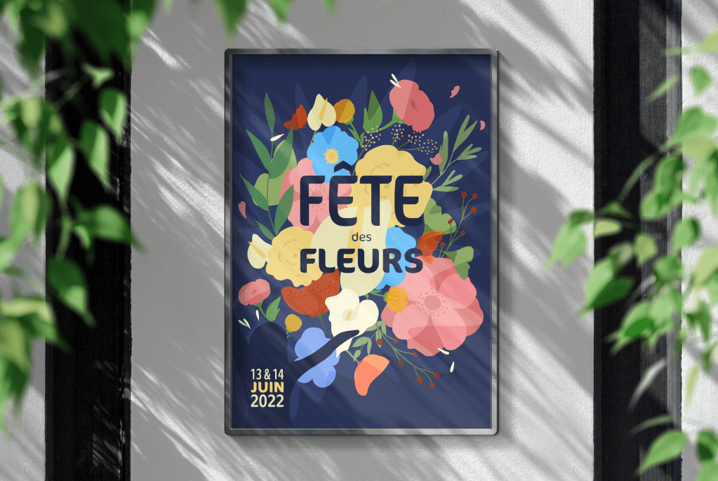 J’ai choisi une palette de couleurs évocatrice du thème floral et festif, en intégrant le titre « Fête des fleurs » et la date « 13 et 14 juin 2022 » avec une typographie soigneusement sélectionnée pour optimiser la lisibilité.